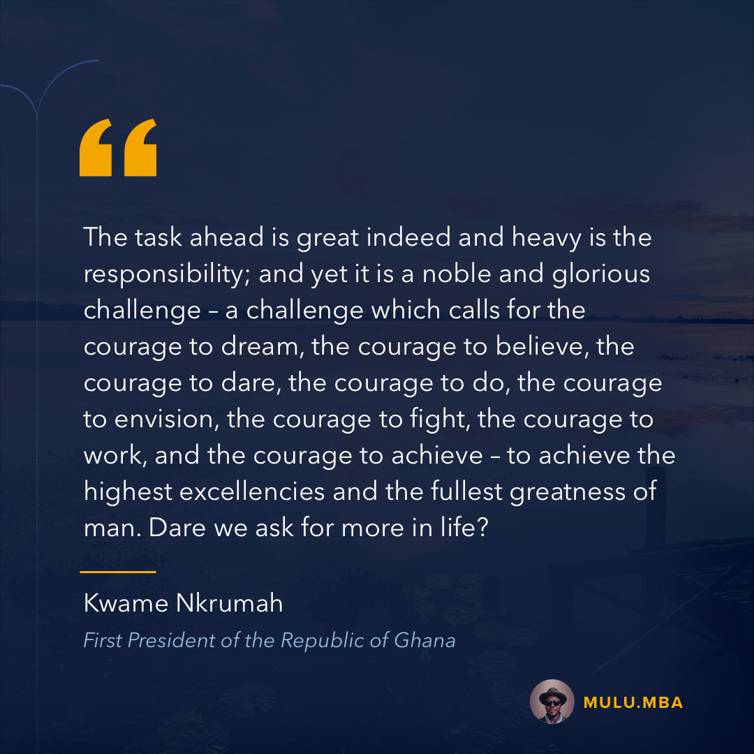 I would like to echo the words of the late Kwame Nkrumah who once said, “the task ahead is great indeed and heavy is the responsibility; and yet it is a noble and glorious challenge – a challenge which calls for the courage to dream, the courage to believe, the courage to dare, the courage to do, the courage to envision, the courage to fight, the courage to work, and the courage to achieve – to achieve the highest excellencies and the fullest greatness of man. Dare we ask for more in life?”